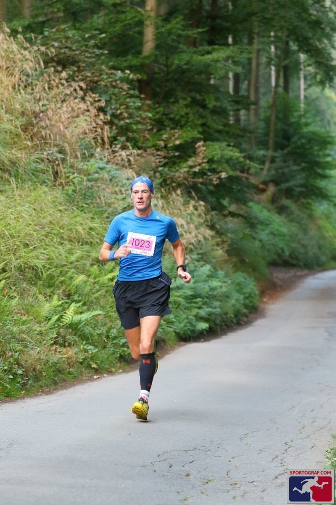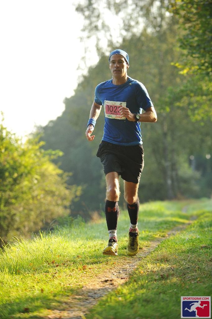 Dat wil niet zeggen dat ik goed kon klimmen, integendeel, daar ligt (nog) bepaald niet mijn kracht. Het duurde dan ook precies 500 meter in de race dat er een eerste deelnemer begon te wandelen. En die was niet van Duitschen Bloed! In het middenveld begonnen (er stonden aan deze langste afstand een mannetje of 100 aan de start), kwam er direct een beklimming. Ja, en ik had me voorgenomen om zo veel mogelijk krachten te sparen in het begin. Degenen die in een klein looppasje me voorbij kwamen hadden niet veel meer snelheid dan ik wandelend had. Halverwege de beklimming kwam er nog een stuk afdaling, en daar werd direct de toon gezet. Ik liet me in de afdaling “vallen” en zoals gewoonlijk haalde ik vele deelnemers in. Het geeft wel een behoorlijke druk op je benen, maar dat verwerk je na de wedstrijd wel weer. Conditioneel kost het me geen enkele kracht, dus waarom er geen gebruik van maken.