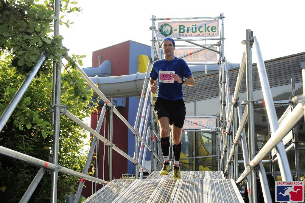 Het hele stadje was uitgelopen. Werkelijk honderden (!!) vrijwilligers leiden dit evenement in goede banen. En dat ging met de Duitse slag, zeer grundlich. Opmerkelijk was dat je geen rugzak of iets dergelijks mee hoefde te nemen, er stond namelijk elke 4 a 5 km een verzorgingspost. Nog nooit meegemaakt bij een (ultra)-trail. Daar word ik wel vrolijk van! Verder was het gewoonweg onmogelijk om fout te lopen. Relatief gezien hoefde je niet vaak een afslag te nemen en als je wel een afslag kreeg, stonden er meerdere hele grote borden om de weg te wijzen. En voor de mensen die met hun hoofd (ogen) omlaag lopen (en die neiging heb ik nog wel eens), hadden ze fel-oranje pijlen op de grond die de juiste weg aangaven. Verder hadden ze ook nog eens linten, politie&brandweer en vrijwilligers op punten staan waar je misschien alsnog kon twijfelen. Heerlijk voor een notoire foutloper als ik.