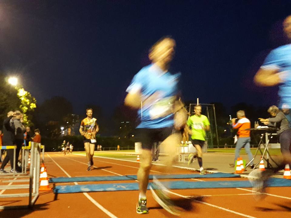 Ik liep de eerste halve ronde in 4e positie, en bij doorkomst van de tweede ronde hoorde ik van de omroeper dat ik koploper was bij de marathonlopers. Voor mij dus alleen estafette-lopers. Bij mij liep Anton die ik net als Wolter regelmatig tegenkom op de trail-wedstrijden. Ook een prima loper, maar meer een diesel, terwijl ik er nog wel eens harder in knal. Voor de rest liepen de andere marathonlopers al op grotere afstand; het zou vanavond tussen ons twee gaan.