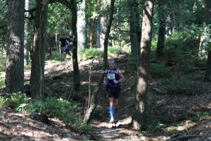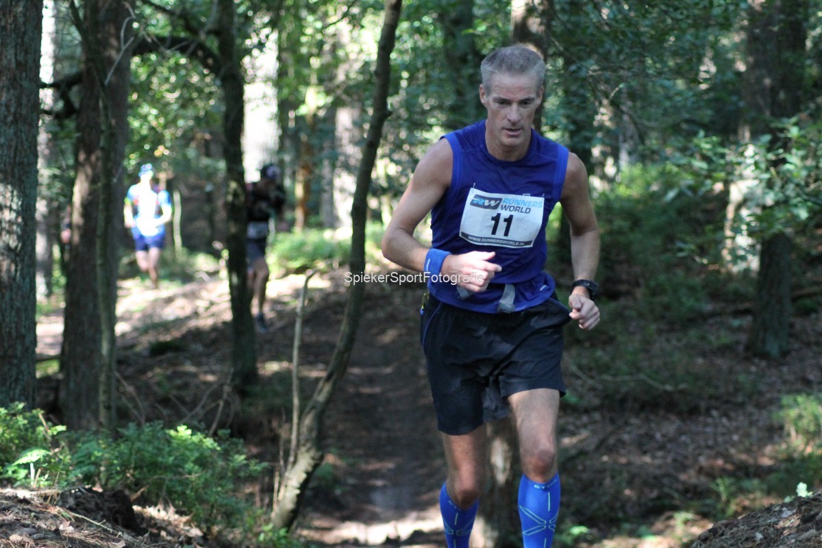 Rustig starten is “de afspraak”. Al snel lopen we in een groepje op positie 3. De km vliegen voorbij en ik kan me het zandgedeelte vanaf km 35 van vorig jaar maar al te goed herinneren dus ik laat de groep lopen. Ik ga nog te snel, maar daar komt vlak voor het 17km punt waarbij we de start passeren abrupt een einde aan. FLATSCH, met het vroegwijze voorhoofd als een lijk tegen de vlakte. Boomwortel over het hoofd gezien. Een minuut lang blijft het orakel liggen, genietend van het zonnetje en de plotselinge ontspanning in de beentjes. Maar de realiteit is nog 37km voor de boeg. Tot km 35 gaat het dramatisch. Niet lekker in het ritme, tegen de zijsteek aan en gelletjes niet kunnen verteren. Tot overmaat van ramp explodeert er een gelletje dat over mijn armen en benen gaat. Dit is het moment dat mijn eeuwenoude Ivan Lendl Adidas zweetband voor de laatste x zijn waarde bewijst. Hij absorbeert de vanille gel en wordt één met de wisent natuur. Op het kootwijkerzand kom ik helemaal niet meer vooruit, gelukkig met nog iemand, al haasje-over slepen we ons er doorheen. Inmiddels ben ik een paar keer ingehaald. Maar dan, na de laatste verzorgingspost, net als vorig jaar, voel ik me ineens weer goed. 8 km lang zonder hapering in één tempo waarbij ik veel korte afstandlopers inhaal en nog twee 54km lopers, waaronder een uit de kopgroep. Ik tuur in verte of ik iets blauws zie wat ik nog kan oprapen, maar dat genoegen is me helaas niet gegund.