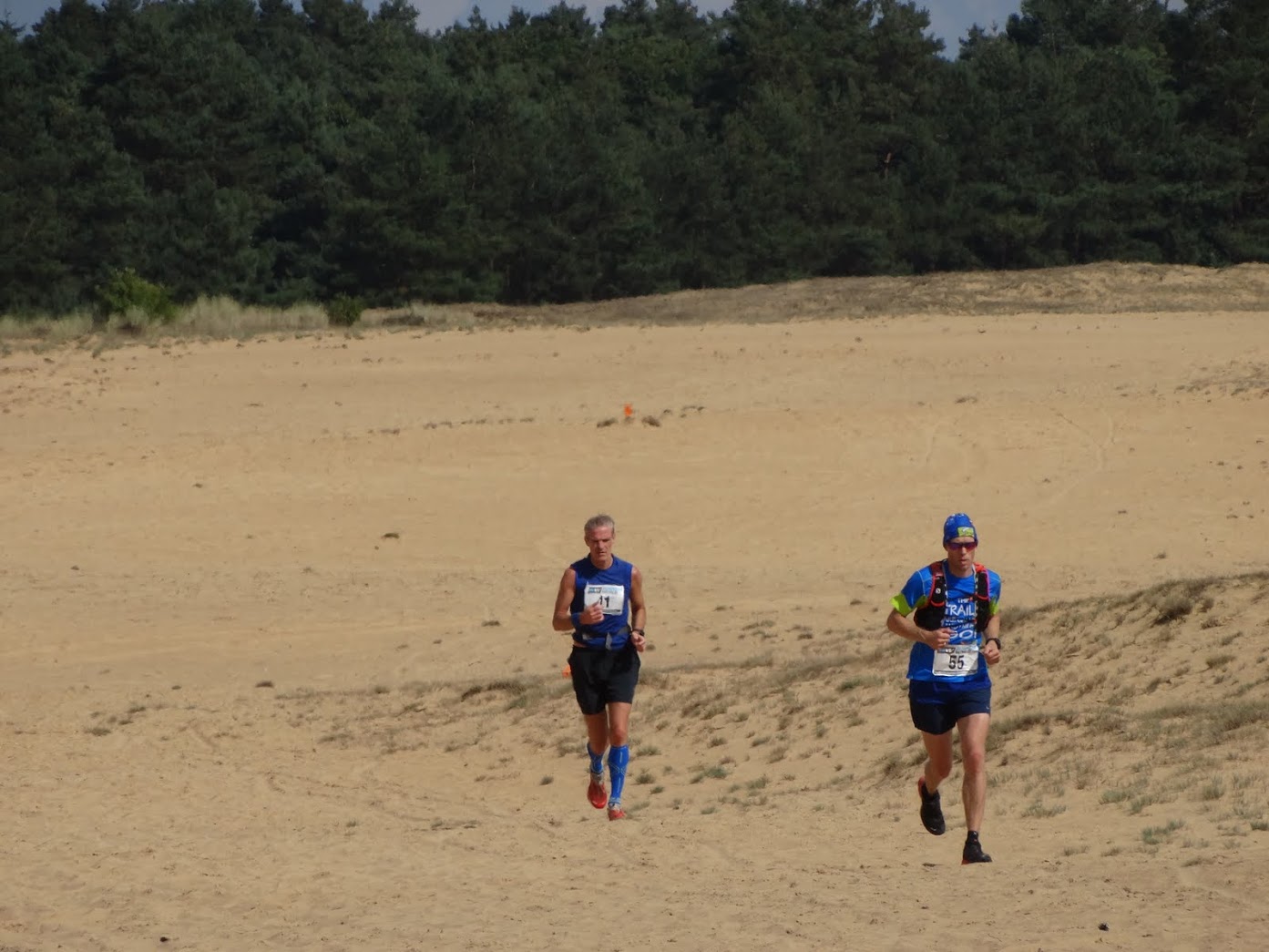 Het zand in. Oei! Dat gaat moeizaam! Ik liet een gat van een meter of 10 vallen. Maar kon de aansluiting nog houden. Vrijwel gelijk bereikten we de post op 35km. Bijtanken, de benen voelden slecht.