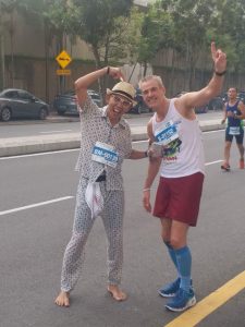 Na de 30 kilometer kwam ik, tussen de duizenden deelnemers, zowaar een bekende tegen. Tan! Een Maleisische bikkel die ik in Sri Lanka al was tegengekomen. Hij liep weer in pyjama en op blote voeten. We hadden ongeveer hetzelfde tempo, dus een tijdje met hem opgelopen. Maar de man is een (wereldwijde) legende, dus hij moest met iedereen op de foto. Wij namen ook nog wat foto’s, en na de wedstrijd stuurde hij me zelfs nog een foto van mij in Sri Lanka op. Tja, kleine wereld!