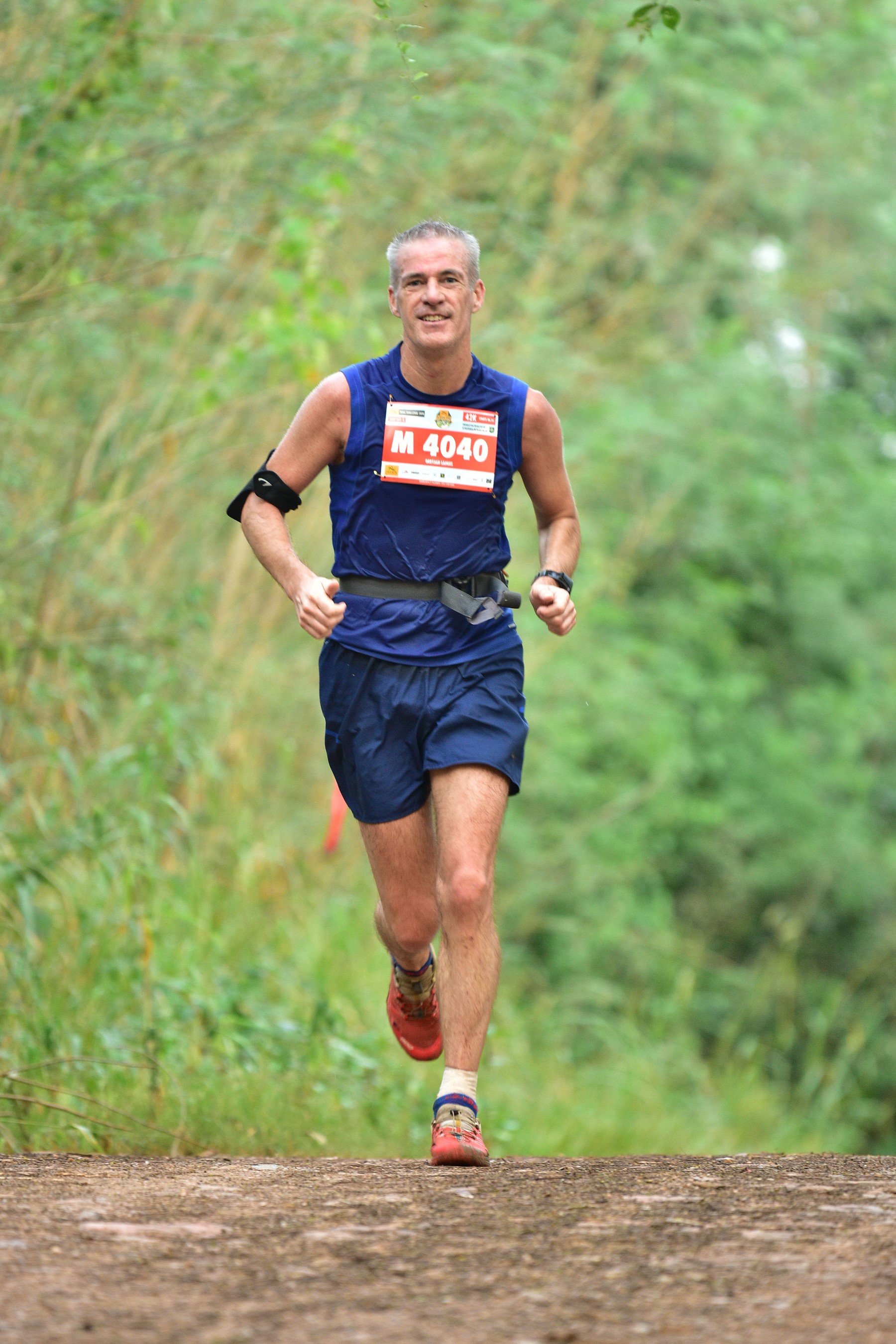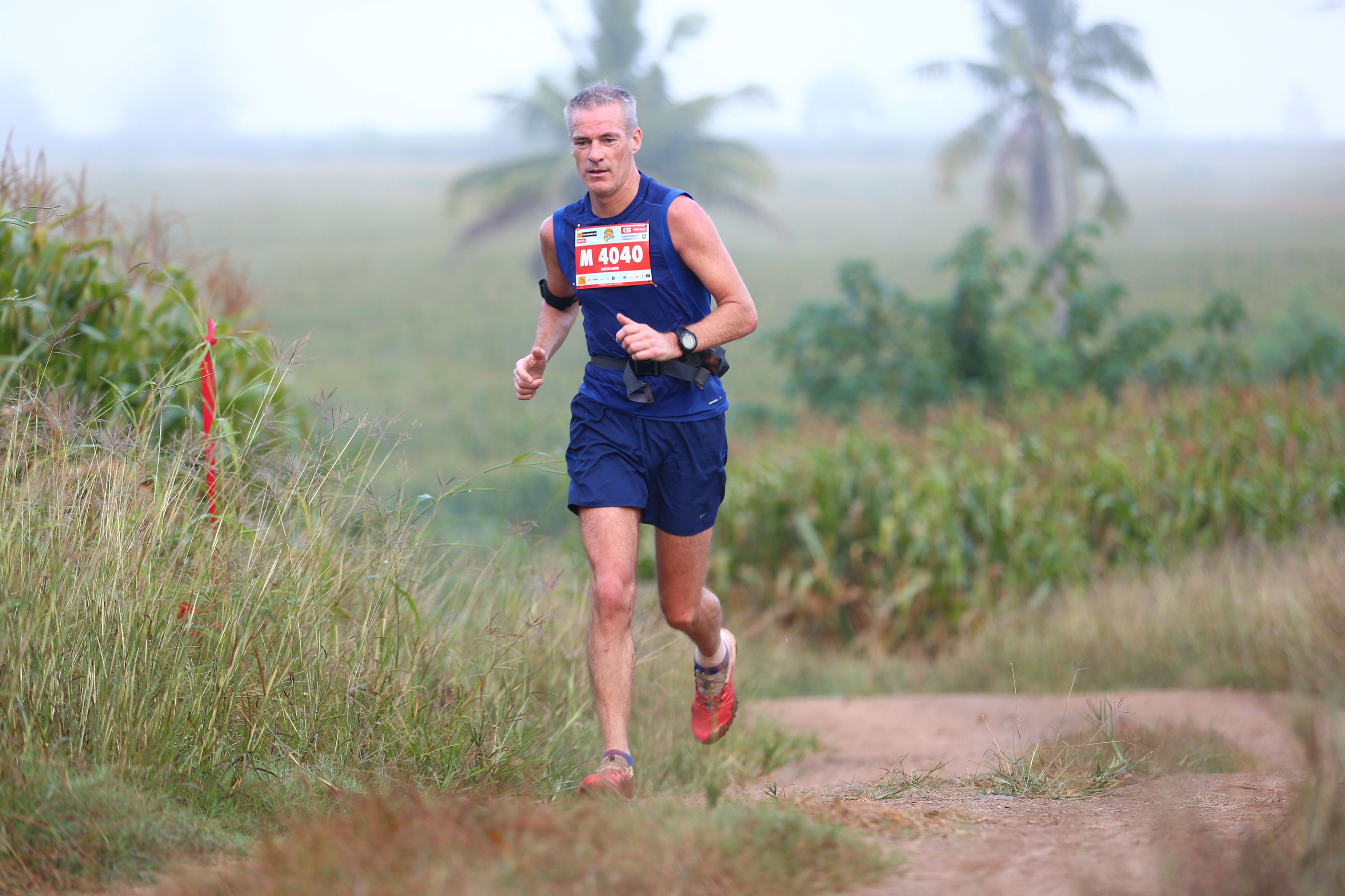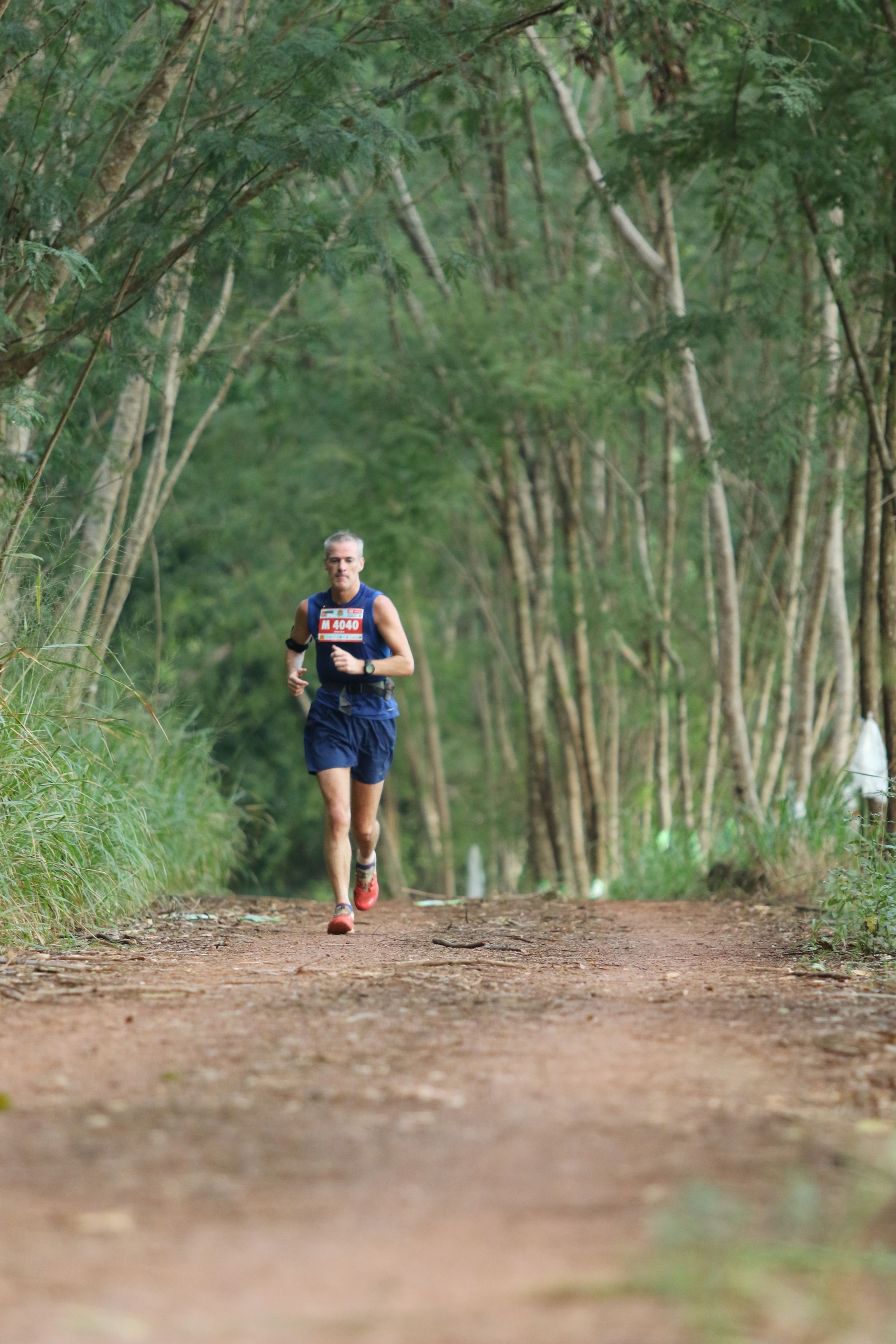 Ik kan niet zeggen dat het een heel mooi parcours was. Je verwacht toch wat leuks van een (grote) trailrun in Thailand. En er waren in dit Nationale Park ook zeker mogelijkheden, maar ze lieten het hier bij paden, omringt door bomen, met weinig uitzicht. Nou ja, dan maar voor de prijzen gaan. En zo tegen halverwege kwam ik inderdaad in de felbegeerde 5e positie te lopen. Maar toen kreeg ik het moeilijk. De zon kwam er steeds iets meer aan te pas, en het liep nu al een tijd langzaam omhoog. Heel erg vermoeiend, je wil zo graag even wandelen, zoals die vele andere deelnemers die ik nu tegenkwam na het wisselpunt halverwege. Iedereen groette me en dat is de eerste 100x nog wel leuk, maar… afijn, u snapt het. Met heul veul pijn en moeite bleef het looppasje erin. Korte steile klimmetjes daargelaten. Ondertussen had er even een wisseling plaatsgevonden. Vlak nadat ik de nummer 4 had ingehaald werd ik even later zelf ook ingehaald. En dus bleef ik 5e. Maar in een tweede gedeelte worden ingehaald ben ik niet echt gewend, dus was nu bang dat er nog meer gevaar van achteren kwam. Dus moest het looppasje erin blijven. Die podiumplek wilde ik behouden. En dat werd een mentale training. Waar ik ondertussen tussen de veelal wandelende halve marathon-deelnemers terecht kwam, wilde ik (en vooral de beentjes) dat ook erg graag, dat wandelen. Maar dat kon ik me niet veroorloven.